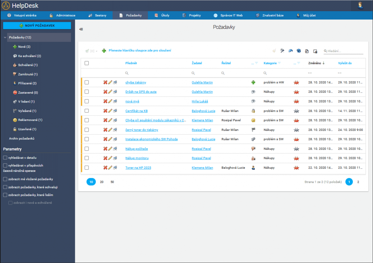 Jedním ze základních prvků HelpDesku jsou požadavky. Do systému je mohou vkládat všichni uživatelé, kteří současně se zadáním určují i jejich prioritu a kategorii, pod kterou spadají.