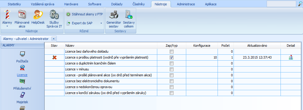 V nástrojích aplikace se nachází karta Alarmy, která slouží k automatickému hlídání a upozorňování na skutečnosti, které mohou vyžadovat pozornost uživatele při správě výpočetní techniky. Definujete-li alarm "Licence s prošlou platnosti (xx dnů před vypršením platnosti)" a ve vlastnostech licence budete evidovat její platnost, pak Vás alarmy mohou automaticky upozornit na blížící se konec platnosti licence nebo třeba ročního servisu.